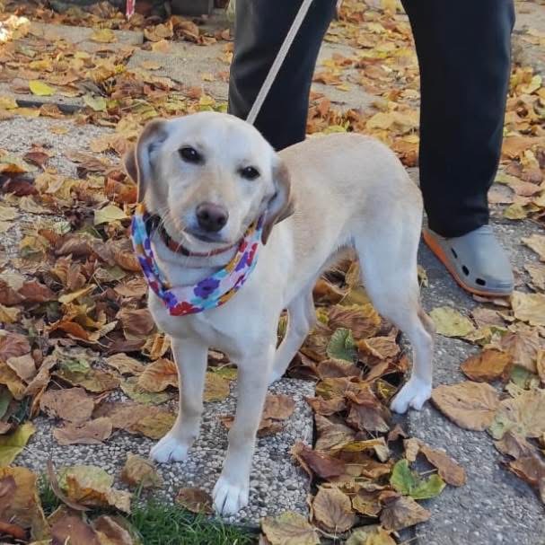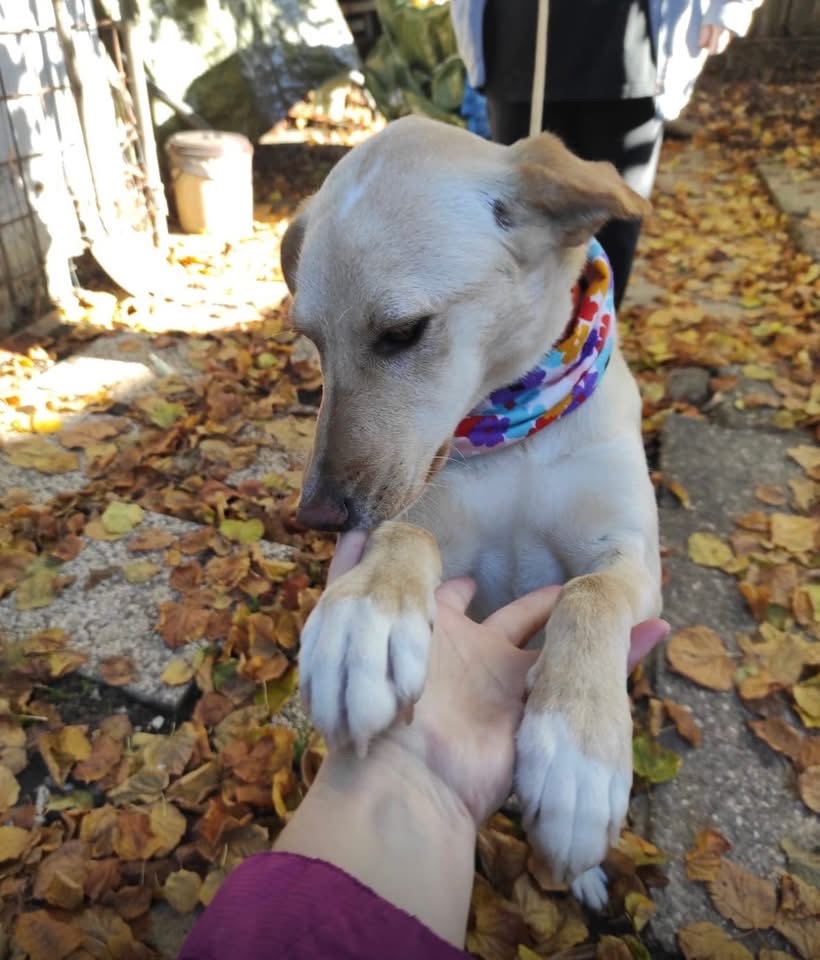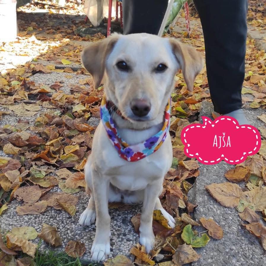 Ajša (Aischa) ist laut Tierarztschätzung zur Zeit etwa 11 Monate alt (geb. 19.01.2025), wiegt nur ca. 10 kg und ist 39 cm groß. Vermutet wird ein Labrador, mit einer sehr kleinen Hunderasse gemischt.