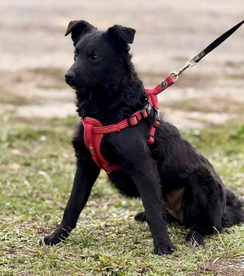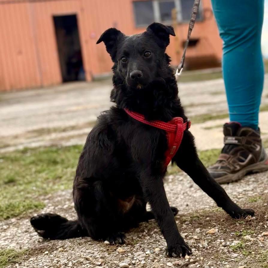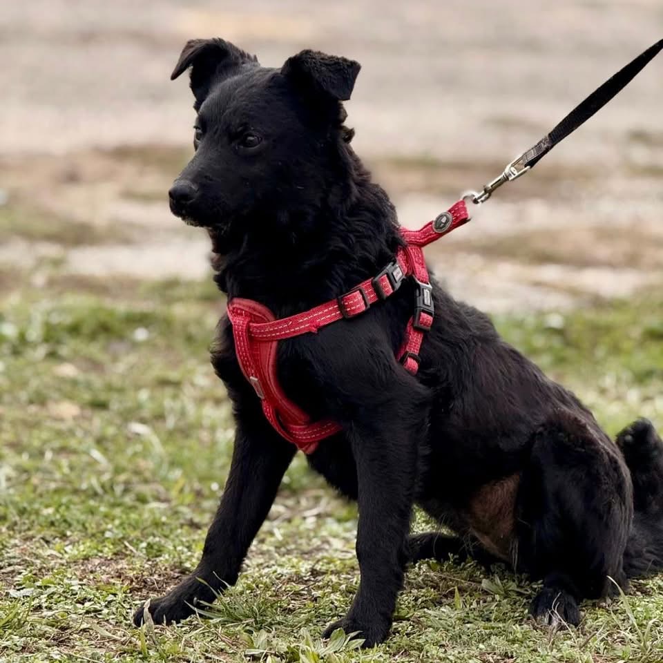Aska ist ein Mädchen, sie ist laut Tierarztschätzung ca. 8 Monate alt (geb. 21.04.2025), 41 cm groß und wiegt 7,7 kg. Vermutet wird ein Mudi–Kroatischer Schäferhund Mischling.