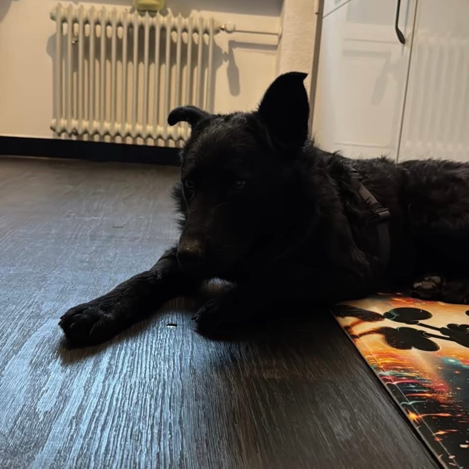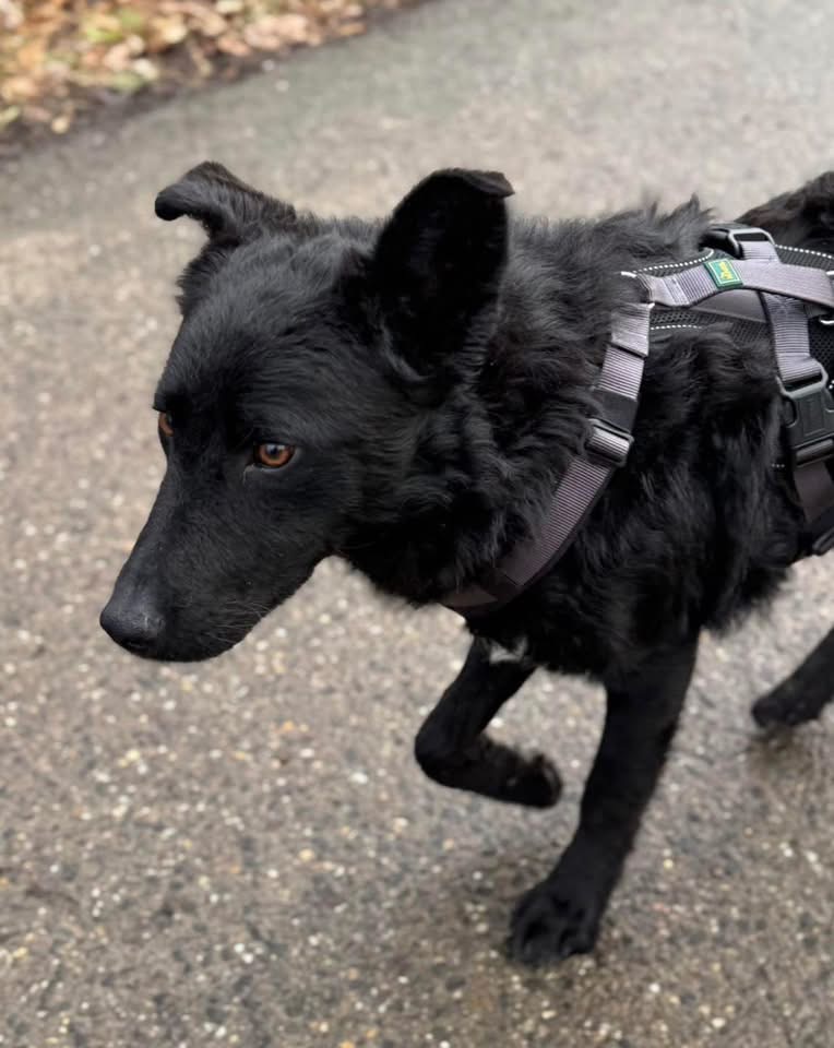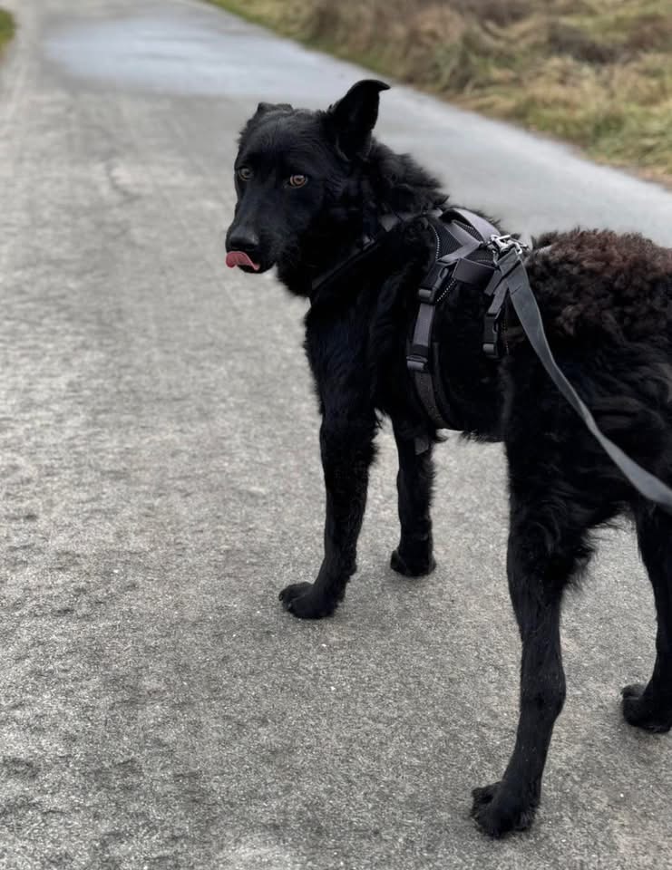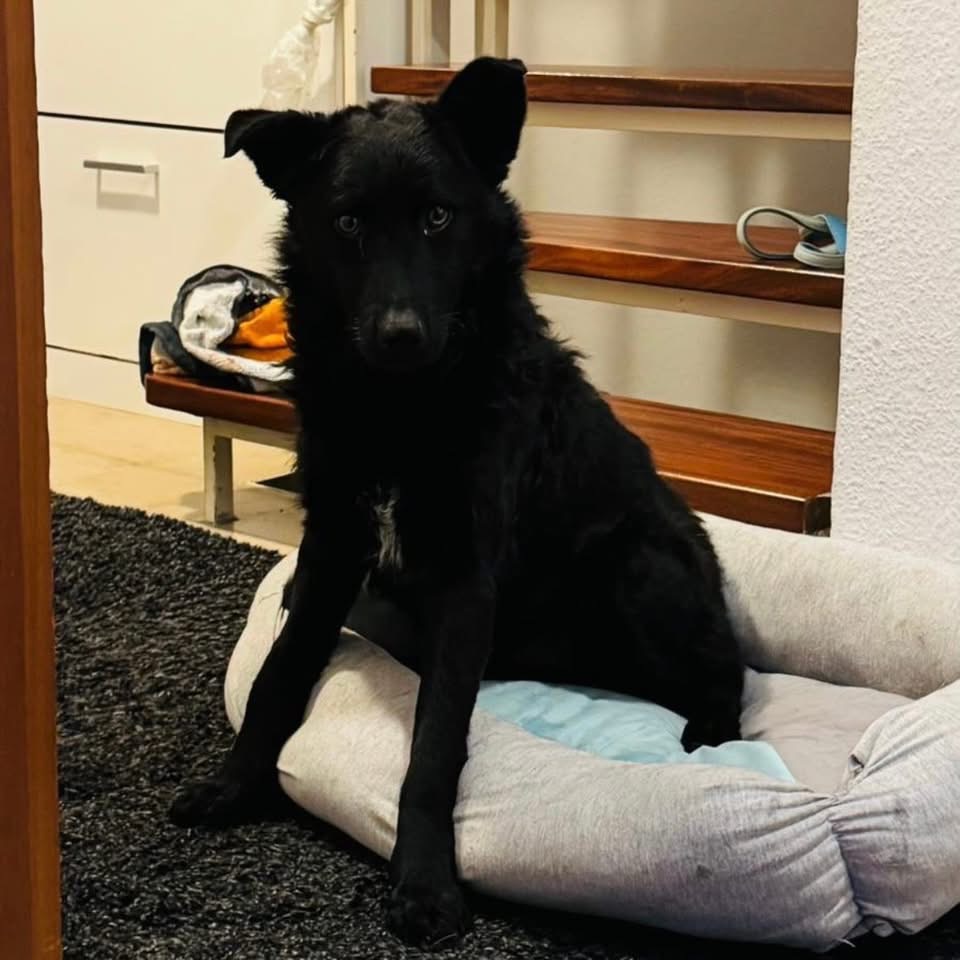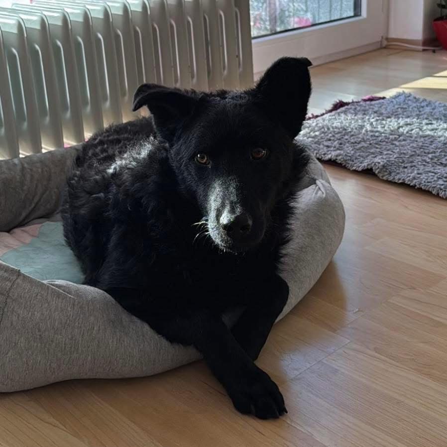 Dado ist ein Bub, er ist ca. 9,5 Monate alt (geb. 19.03.2025), wiegt 18kg und ist 50cm groß. Eigentlich schon bis auf 1-2cm ausgewachsen. Vermutet wird ein Kroatischer Schäferhund-Mudi-Mix. Dado ist rassentypisch mit einer kurzen Rute geboren.