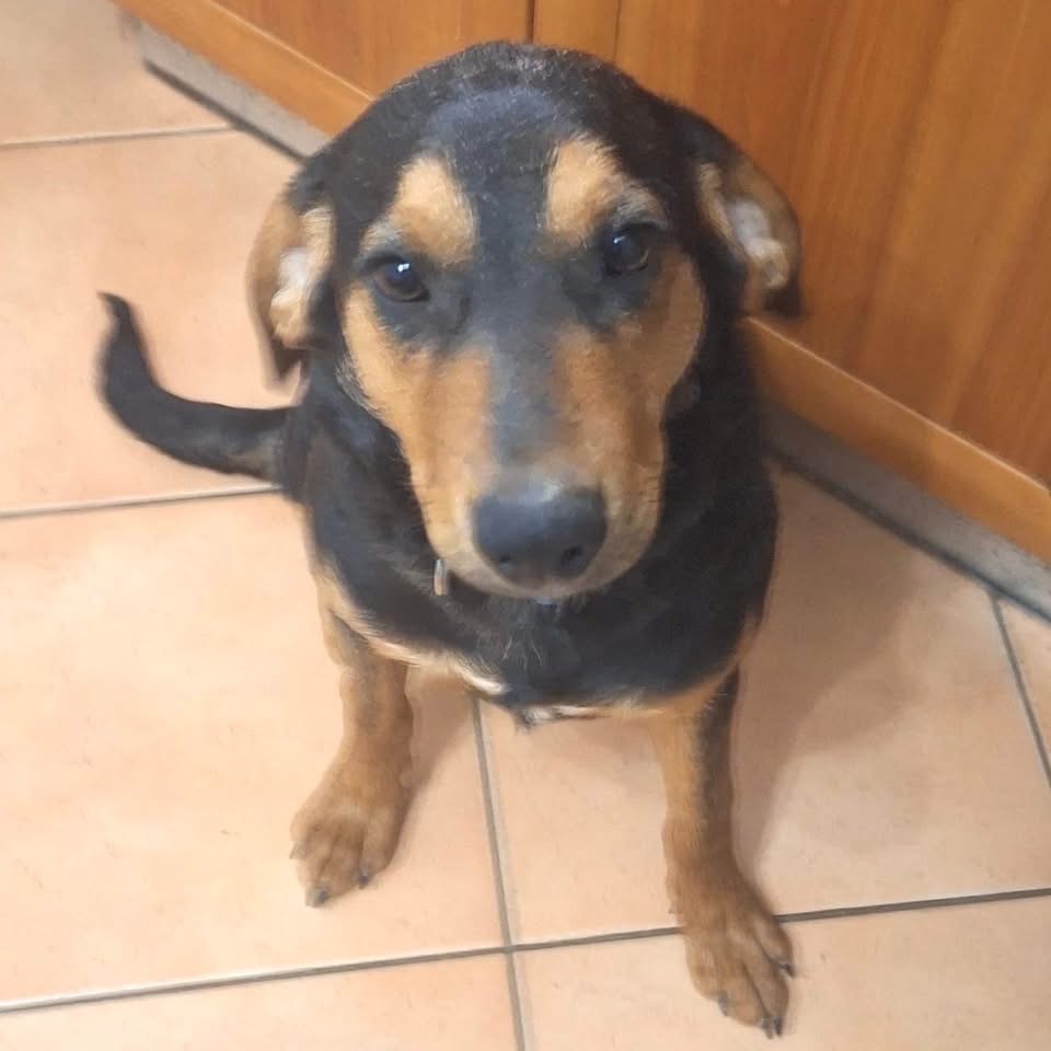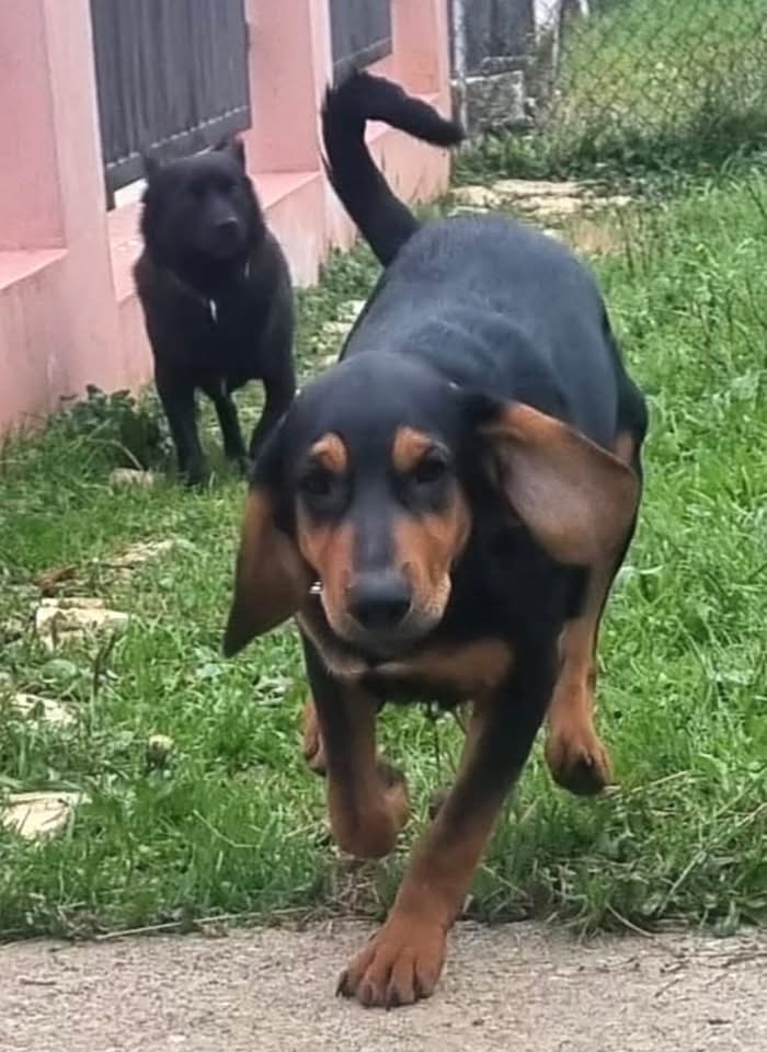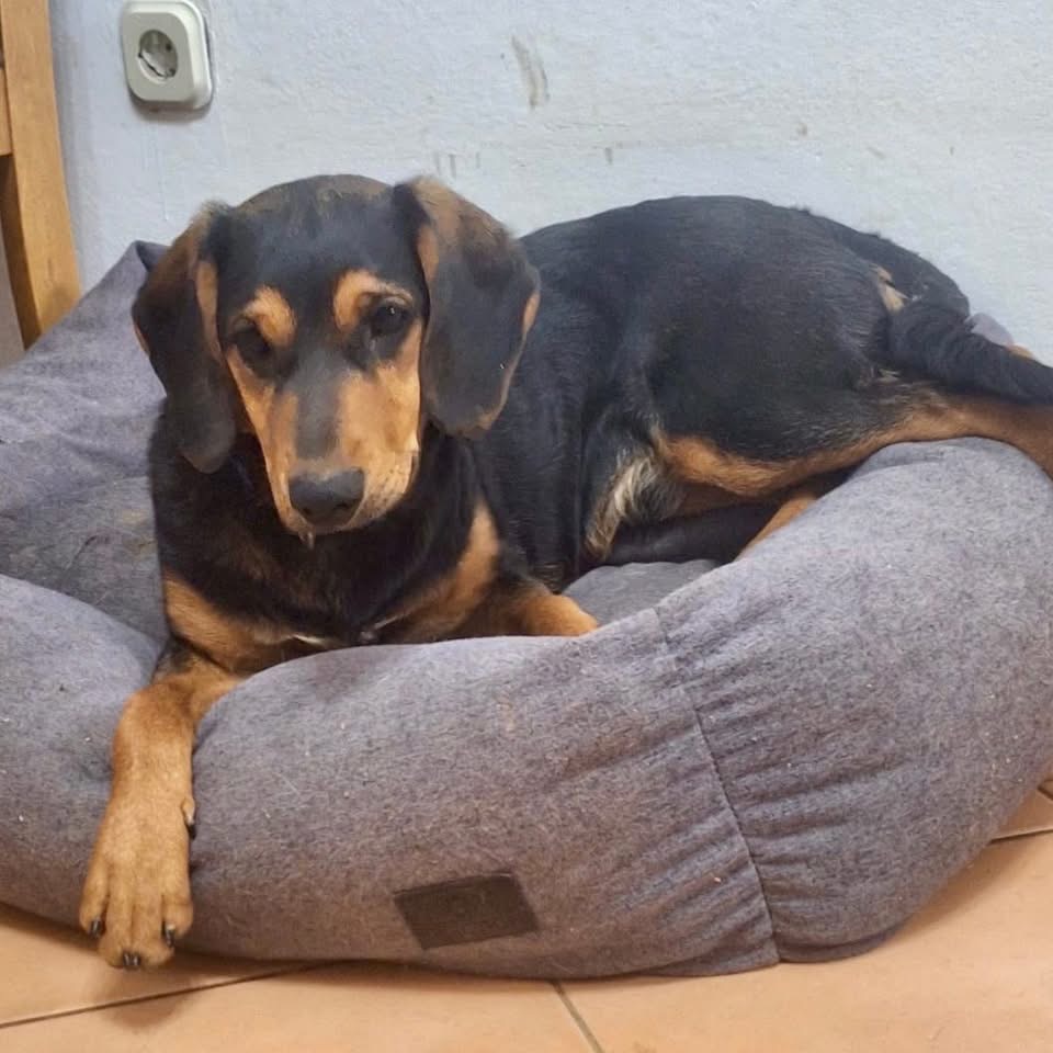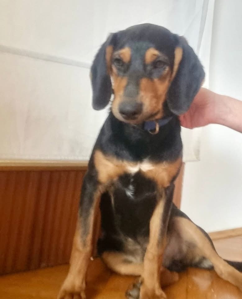 Don ist ein Bub, laut Tierarztschätzung ca. 7 Monate alt (geb. 20.06.2025), wiegt aktuell 16 kg und hat eine Rückenhöhe von 43 cm. Vermutet wird ein Beagle-Bracke Mischling.