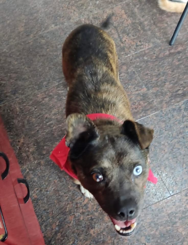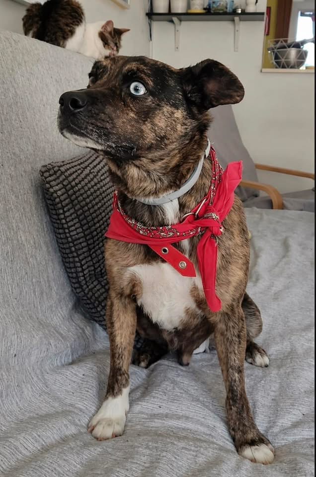 Edo ist ein Rüde, laut Tierarztschätzung ca. 7 Jahre alt (geb. 15.06.2019), 41 cm groß und wiegt etwa 12 kg. Vermutet wird ein aussergewöhnlicher kleiner Querbeet Mischling. Besonders auffällig sind seine Augen – eines ist komplett blau, das andere nur ein blauer Punkt.