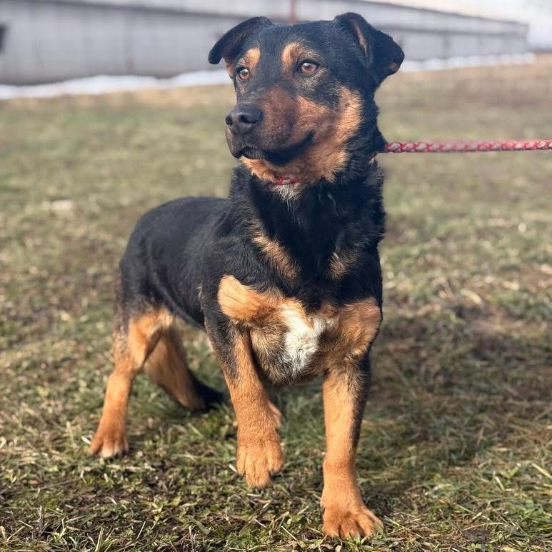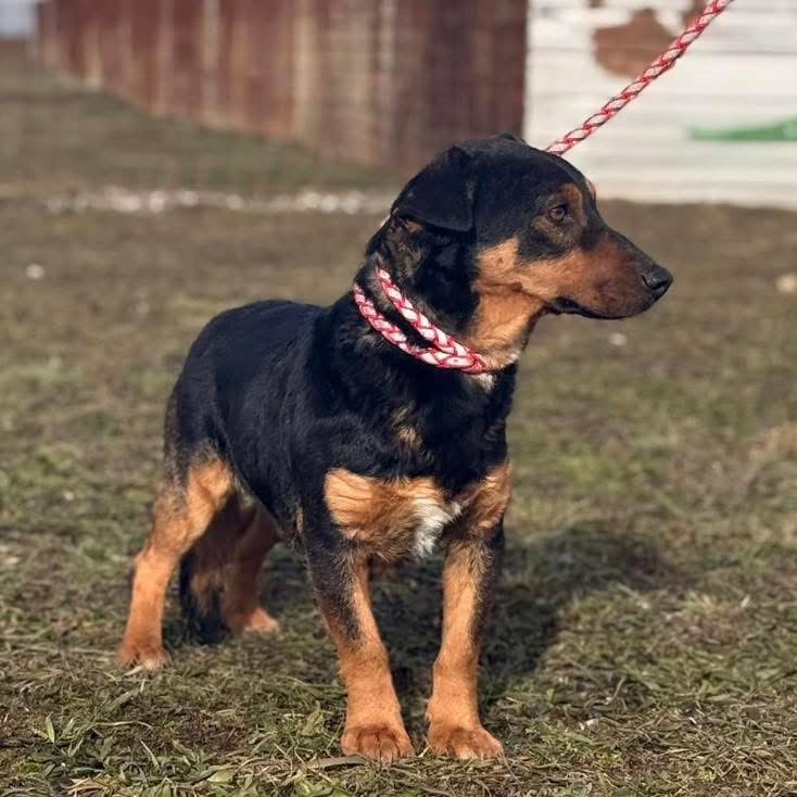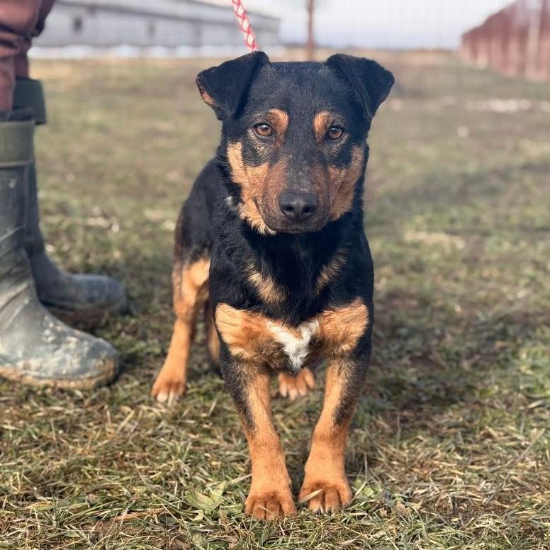 Ivo ist ein Rüde und laut Tierarztschätzung ca. 2 Jahre alt (geb. 17.03.2024). Er ist 35 cm groß, wiegt 12,1 kg und ist ein kleiner Hund mit großer Ausstrahlung. Sein Fell ist tiefschwarz, an den Beinen und an der Schnauze schimmert es goldfarben (black and tan). Vermutet wird ein kleinerer Beaucheron / Dackel / Deutscher Jagdterrier – Mischling.