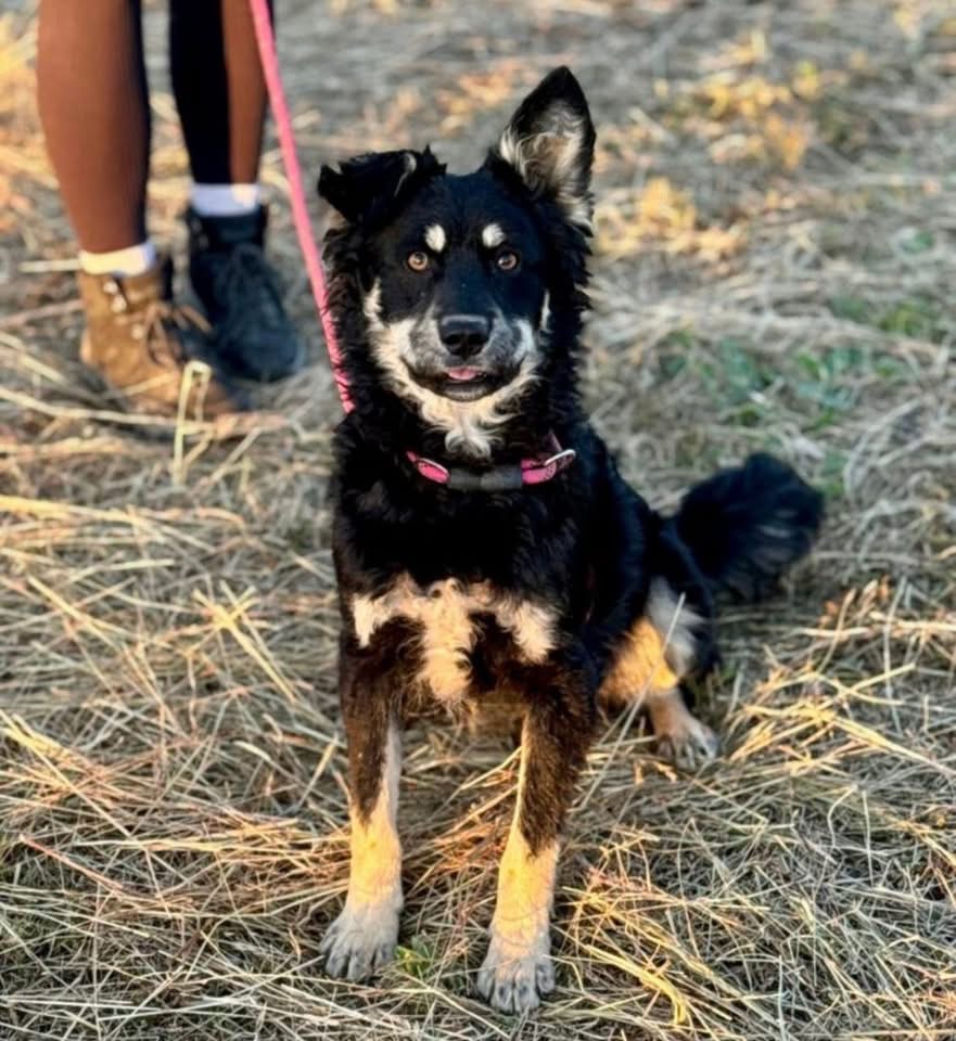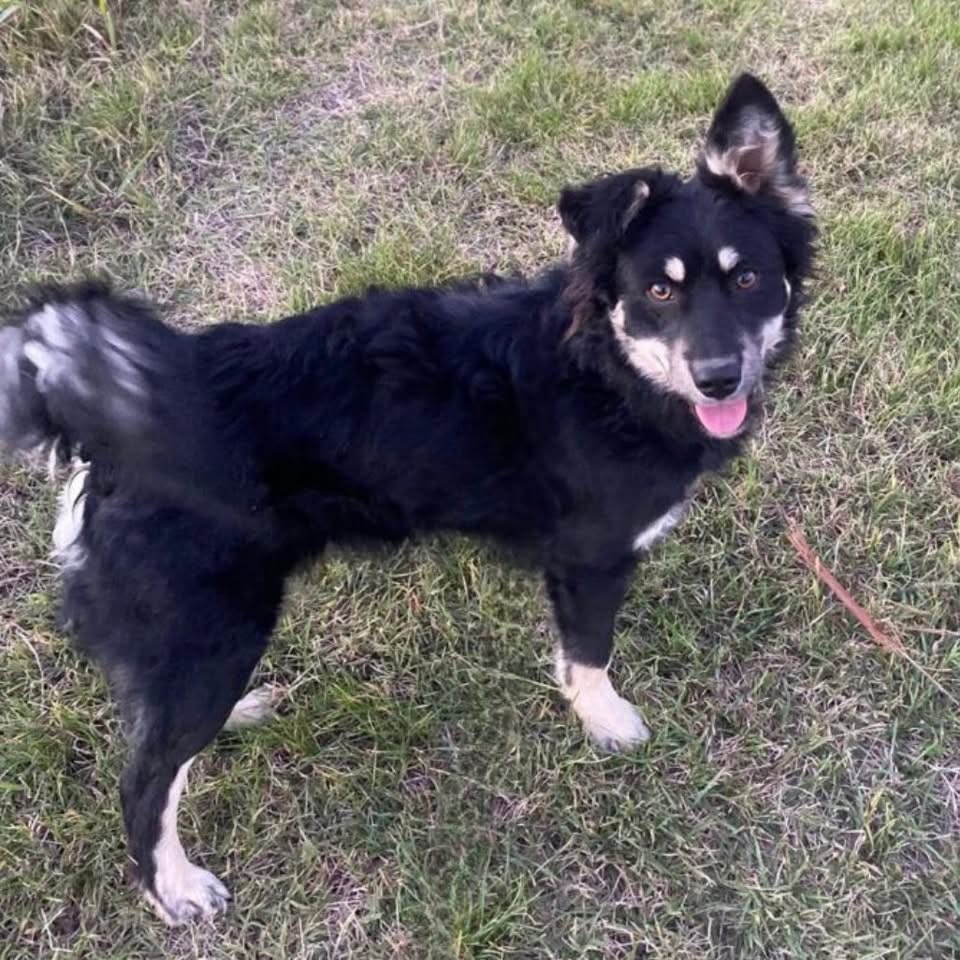 Jimbo ist laut Tierarztschätzung ca. 1 Jahr alt (geb. 12/2024), etwa 49 cm groß und wiegt rund 12,5 kg. Vermutet wird ein Australian Kelpie – Mudi Mischling.