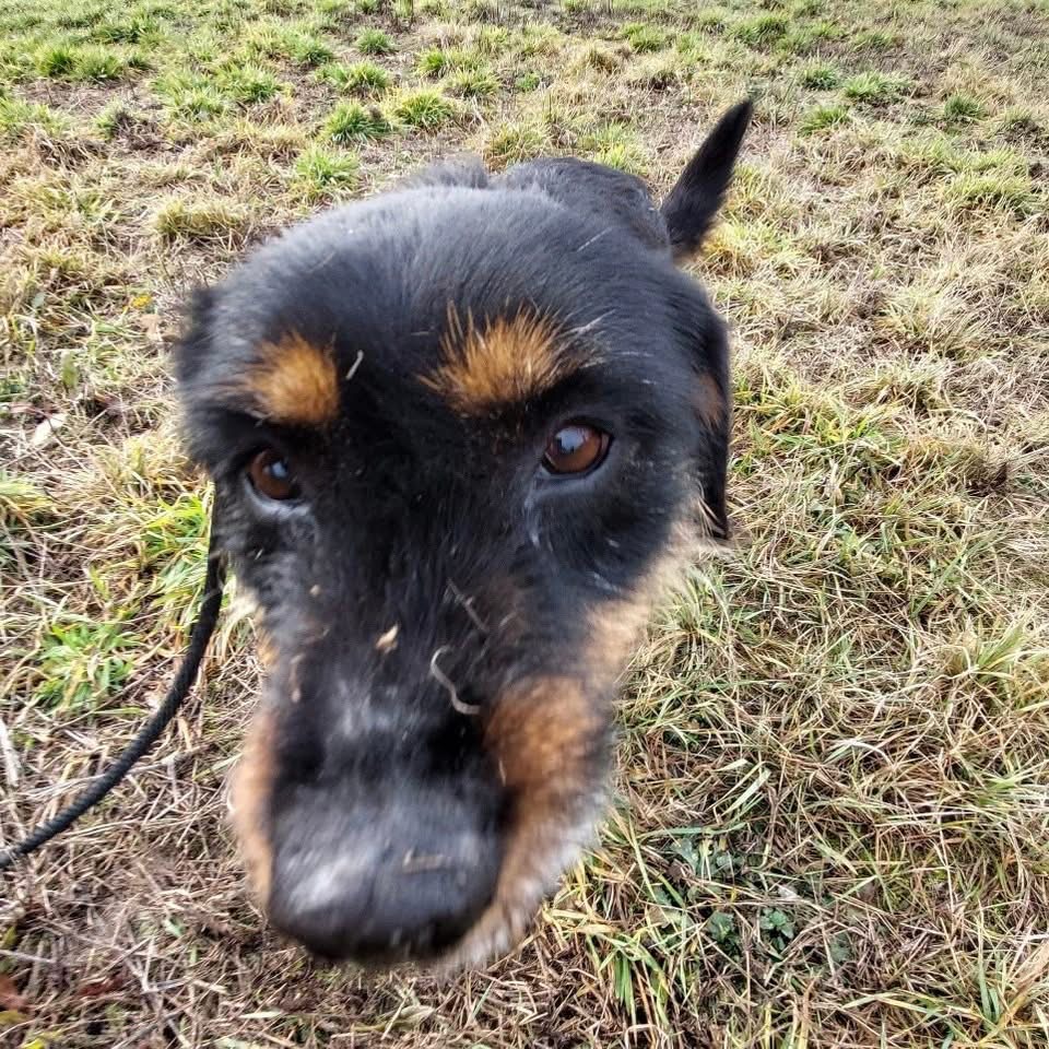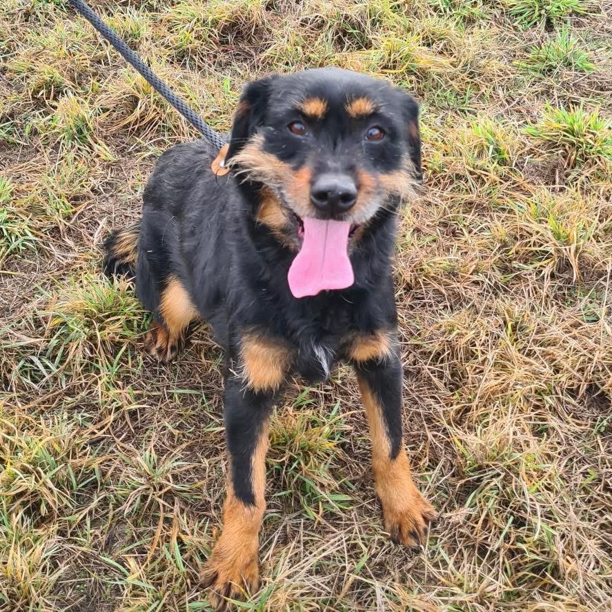 Lyra ist ein Mädchen, laut Tierarztschätzung ca. 7,5 Jahre alt (geb. 04.10.2018), sie ist 53 cm groß und wiegt 17 kg. Vermutet wird ein Deutscher Jagdterrier Mischling.