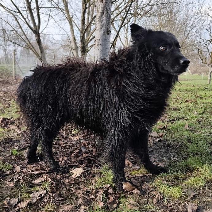 Marlo ist ein Rüde, laut Tierarztschätzung ca. 1 Jahr alt (geb. 09.01.2025), wiegt 16 kg und ist 54 cm groß. Vermutet wird ein Mudi – Kroatischer Schäferhund Mischling. Er ist auch Rassentypisch mit kurzer Rute geboren.