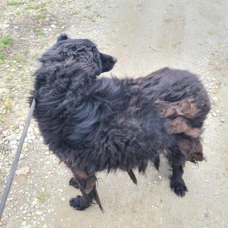 Sein Fell ist derzeit in einem sehr schlechten, völlig verfilzten Zustand. Eine Volontärin konnte einige stark verknotete Stellen vorsichtig herausschneiden. Der Schwanz war jedoch eine einzige harte Filzmasse – ein Teil konnte entfernt werden, der Rest bislang nicht. Dass er empfindlich reagiert, wenn man ihn dort berührt, ist absolut verständlich.
