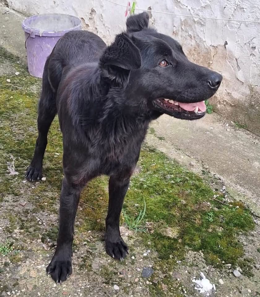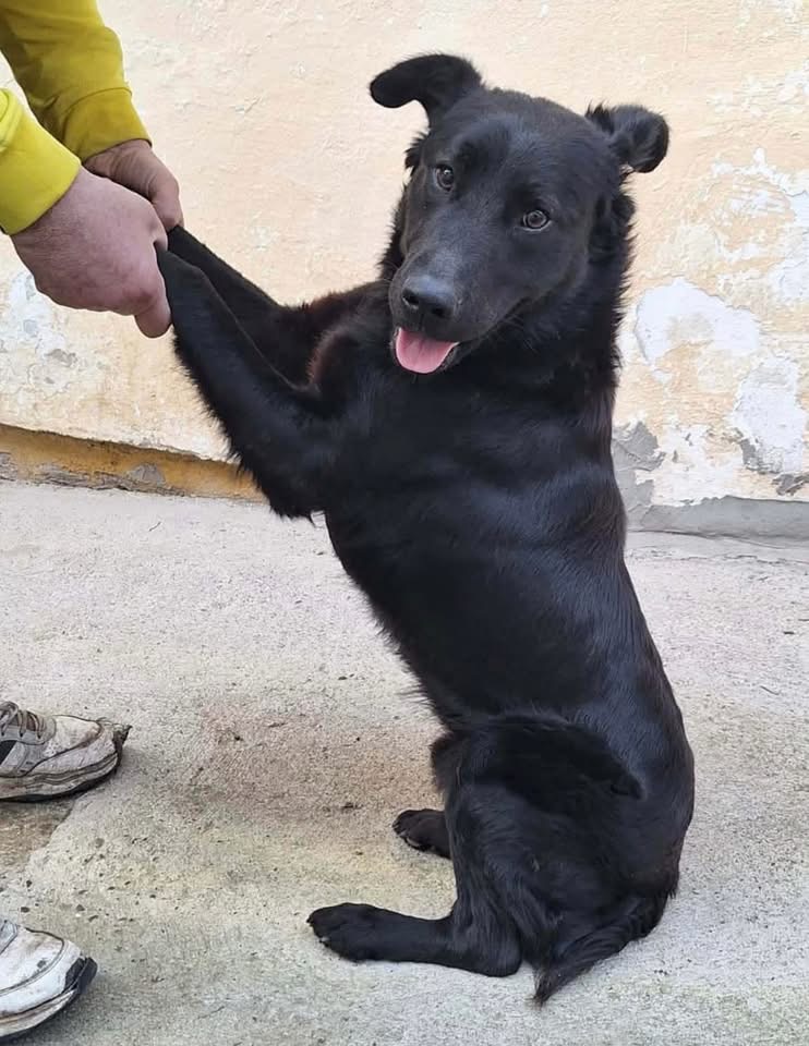Pan ist ein Bub, laut Tierarztschätzung ca. 9 Monate alt (geb. 06.07.2025), wiegt etwa 19 kg und ist 54 cm groß. Vermutet wird ein Labrador – Kroatischer Schäferhund Mischling. Seine Rute ist kurz, wahrscheinlich ist er so geboren.