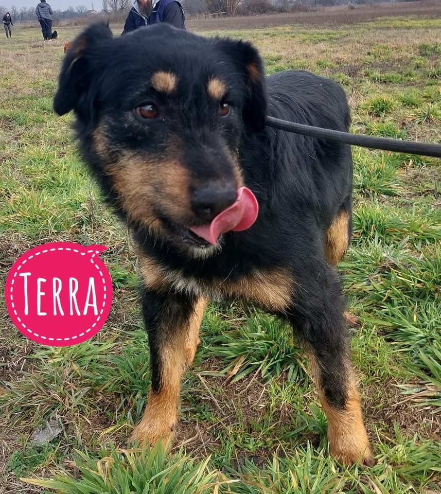 Terra ist ein Mädchen, laut Tierarztschätzung ca. 5,5 Jahre alt (geb. 20.10.2020), ist 56 cm groß und wiegt 18 kg. Vermutet wird ein Deutscher Jagdterrier Mischling.