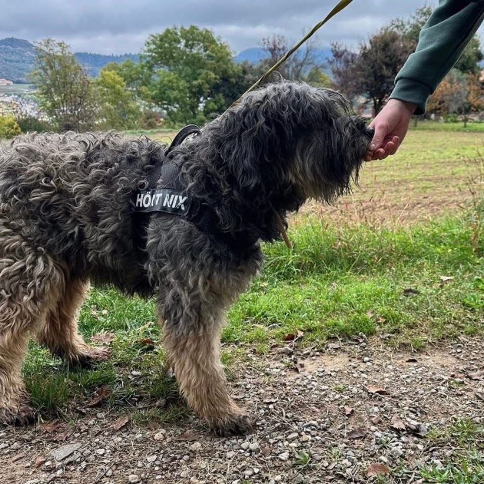 Tro stammt er aus einer Beschlagnahmung: Neun Hunde waren sich selbst überlassen in einem Garten bei einem spanischen Besitzer. Seitdem wartet Tro darauf, endlich gesehen zu werden, sitzt bereits seit 3 Jahren im einem spanischen Tierheim und ist dort in seinem Zwinger sichtlich überfordert.
