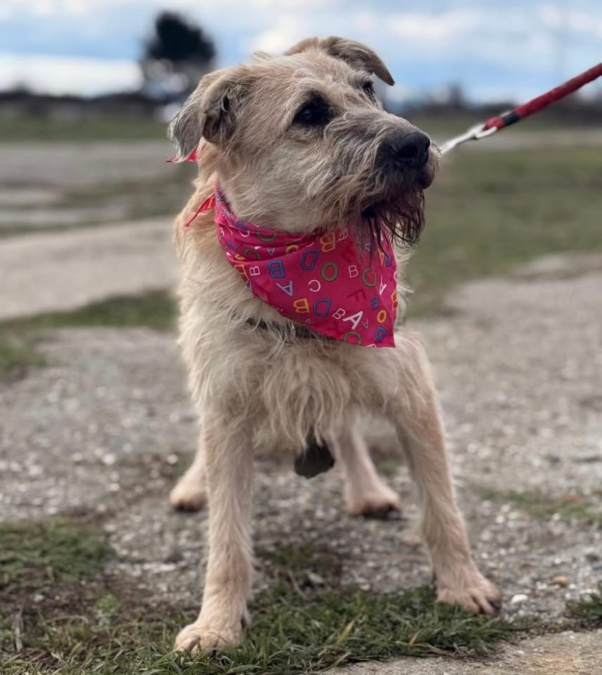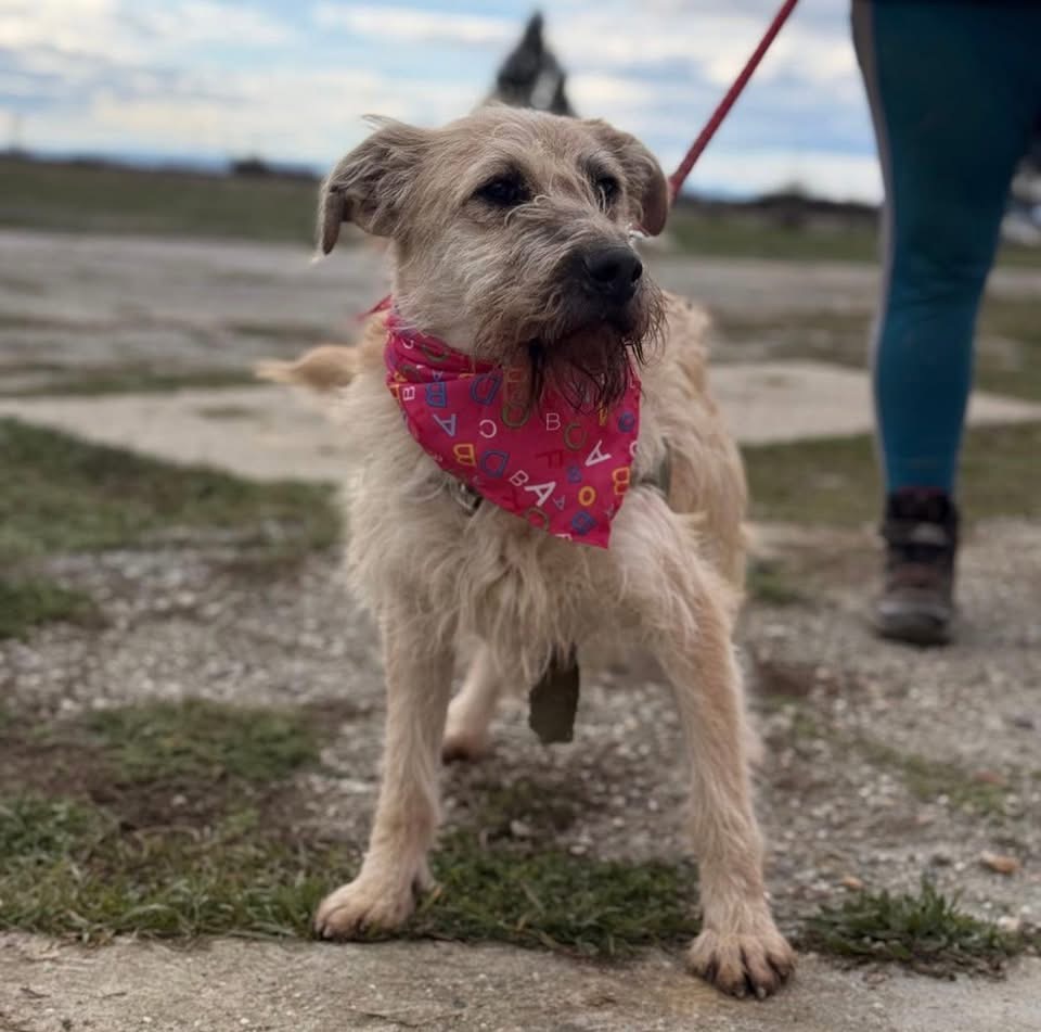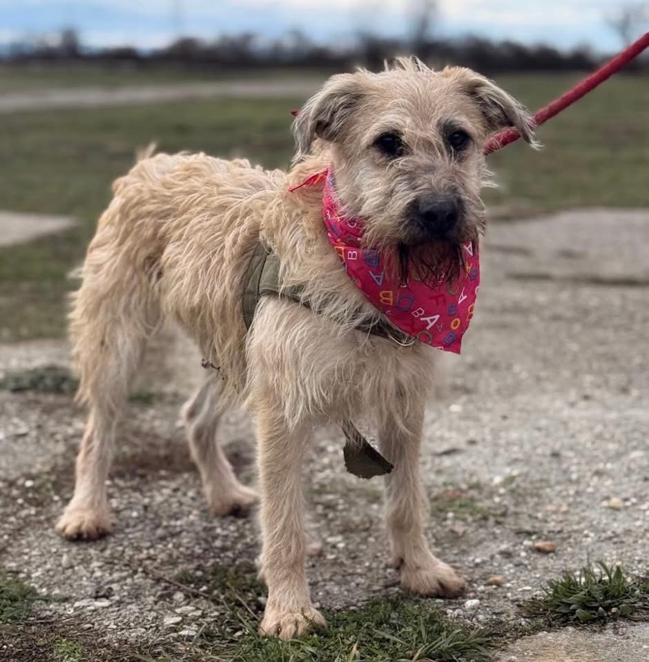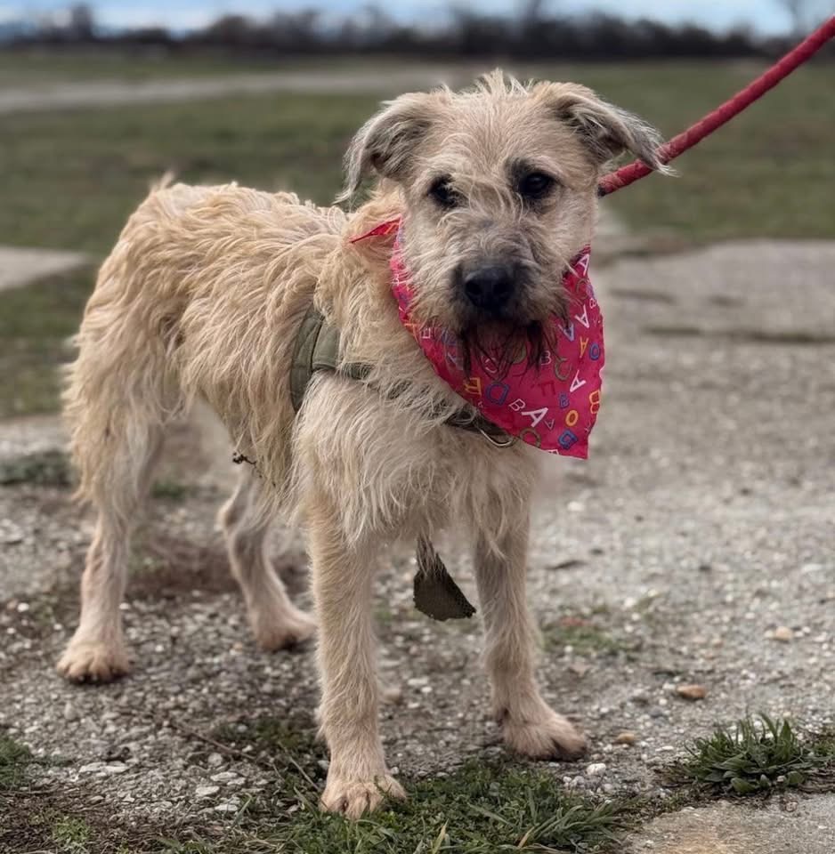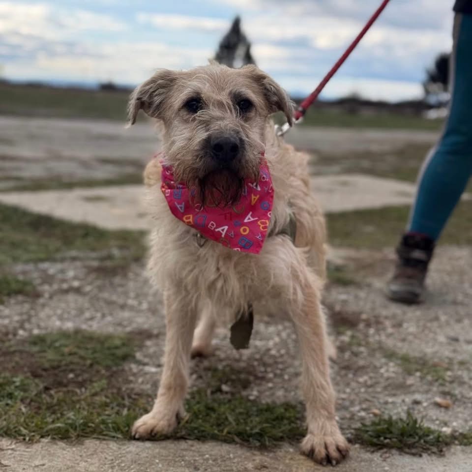 Uma ist ein Mädchen, sie ist laut Tierarztschätzung ca. 1 Jahr alt (geb. 01.10.2024), wiegt 15,6 kg und ist 51 cm groß. Vermutet wird ein Terrier-Mischling, der optisch ein wenig an einen kleineren Wolfshund erinnert.